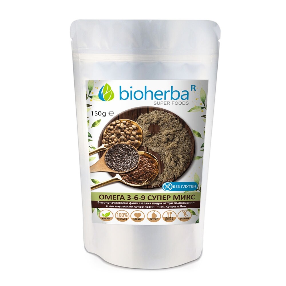 Описание: Миксът от растителни пудри съчетава ценния хранителен състав и качества на едни от най-използваните супер храни - коноп, чия и лен. Характеризира се с високо протеинно съдържание, Омега-3, 6 и 9 мастни киселини, фибри, желязо, магнезий, калций, цинк, витаминен комплекс. Финна консистенция и приятен вкус.