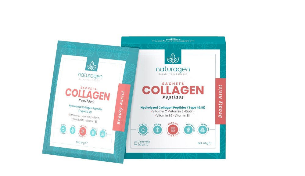 ОЛАГЕН ПЕПТИДИ САШЕТА 10гр.,7 БРОЯ В КУТИЯ С ВКУС НА ПРАСКОВА Съдържа: Разтворим телешки колаген пептиди за доза чаша вода.