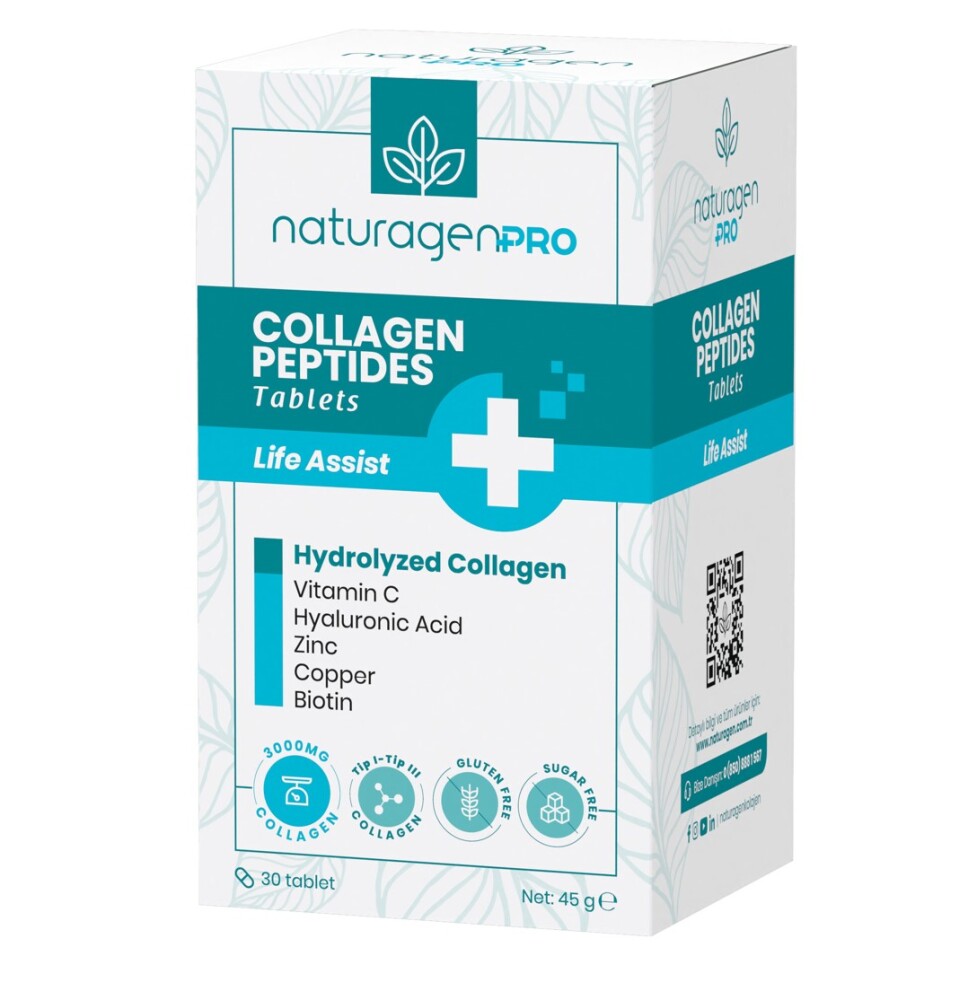 Състав: Хидролизиран колаген (телешки - тип 1 и 3), Микрокристална целулоза (стабилизатор), Л-аскорбинова киселина, Поливинил пиролидон (стабилизатор), Хиалуронова киселина, Магнезиеви соли на мастни киселини (антислепващ агент), цинк сулфат , силикон диоксид (антислепващ агент), меден сулфат, Д-биотин .